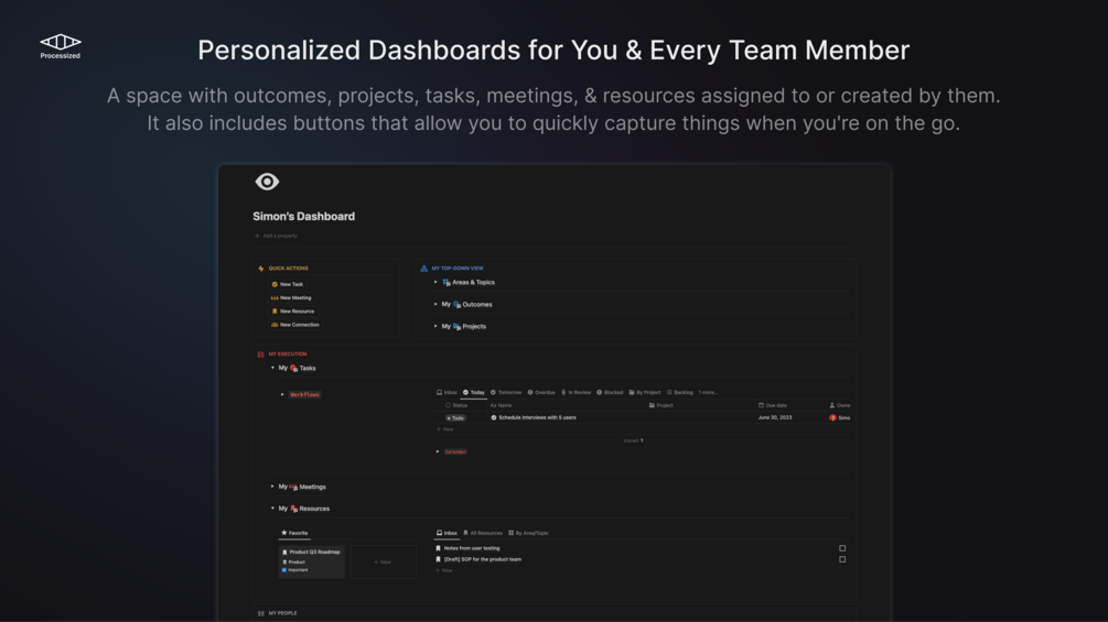 - Personalized Dashboards: Each team member gets a dedicated dashboard for outcomes, projects, tasks, meetings, and resources.